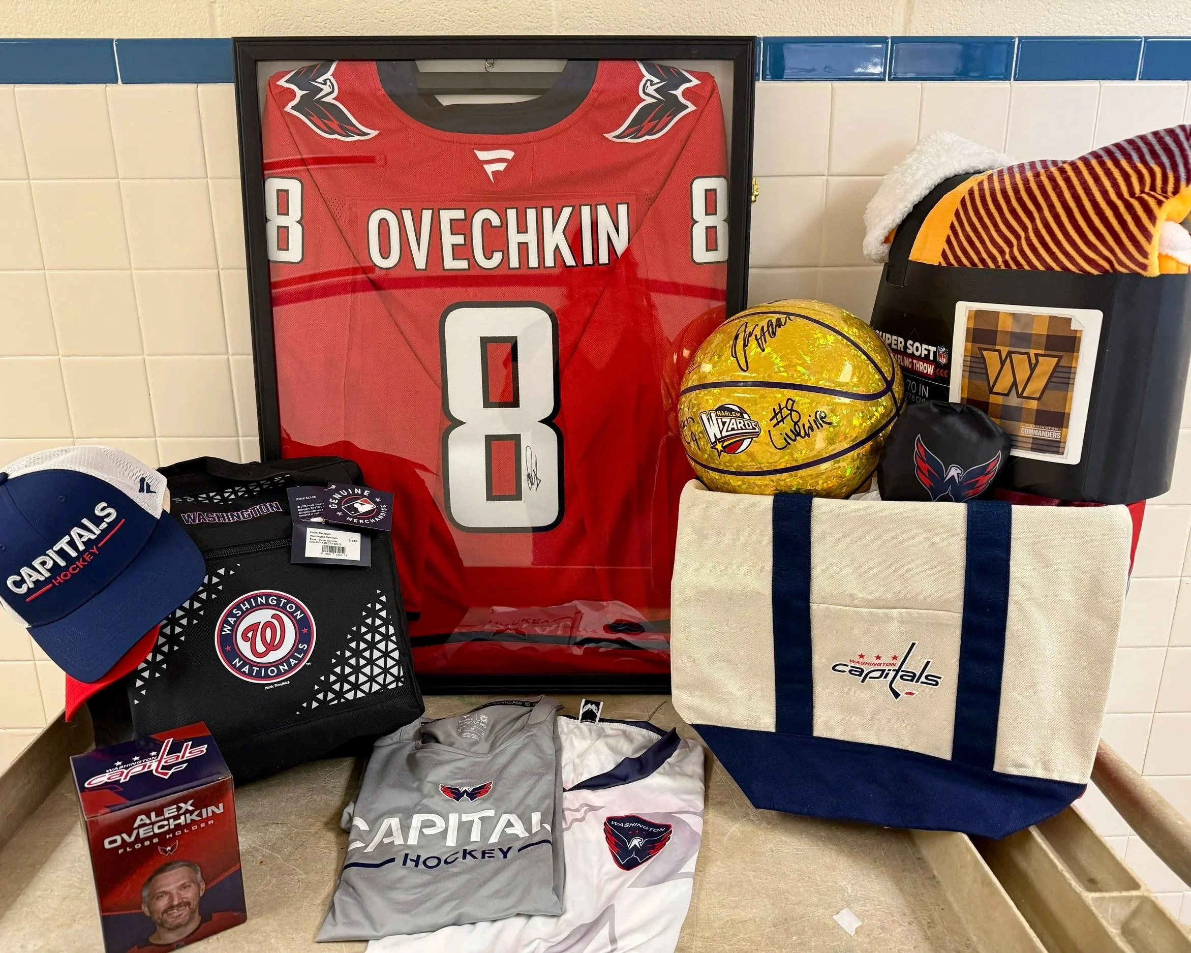 Score big with this MVP-worthy raffle basket which brings together the best of D.C. sports - an all-star collection for the ultimate fan! This line-up is stacked with championship-level excitement featuring an autographed Alexander Ovechkin Washington Capitals jersey and an autographed Pierre-Luc Dubois Washington Capitals cap. Add a slam dunk to your collection with an autographed Harlem Wizards basketball. Rep your hometown pride with Washington Capitals gear including jerseys, a Washington Nationals backpack cooler (perfect for tailgates, picnics, or cheering from the sidelines), and a Washington Commanders sherpa blanket (stay cozy as you watch every play unfold).