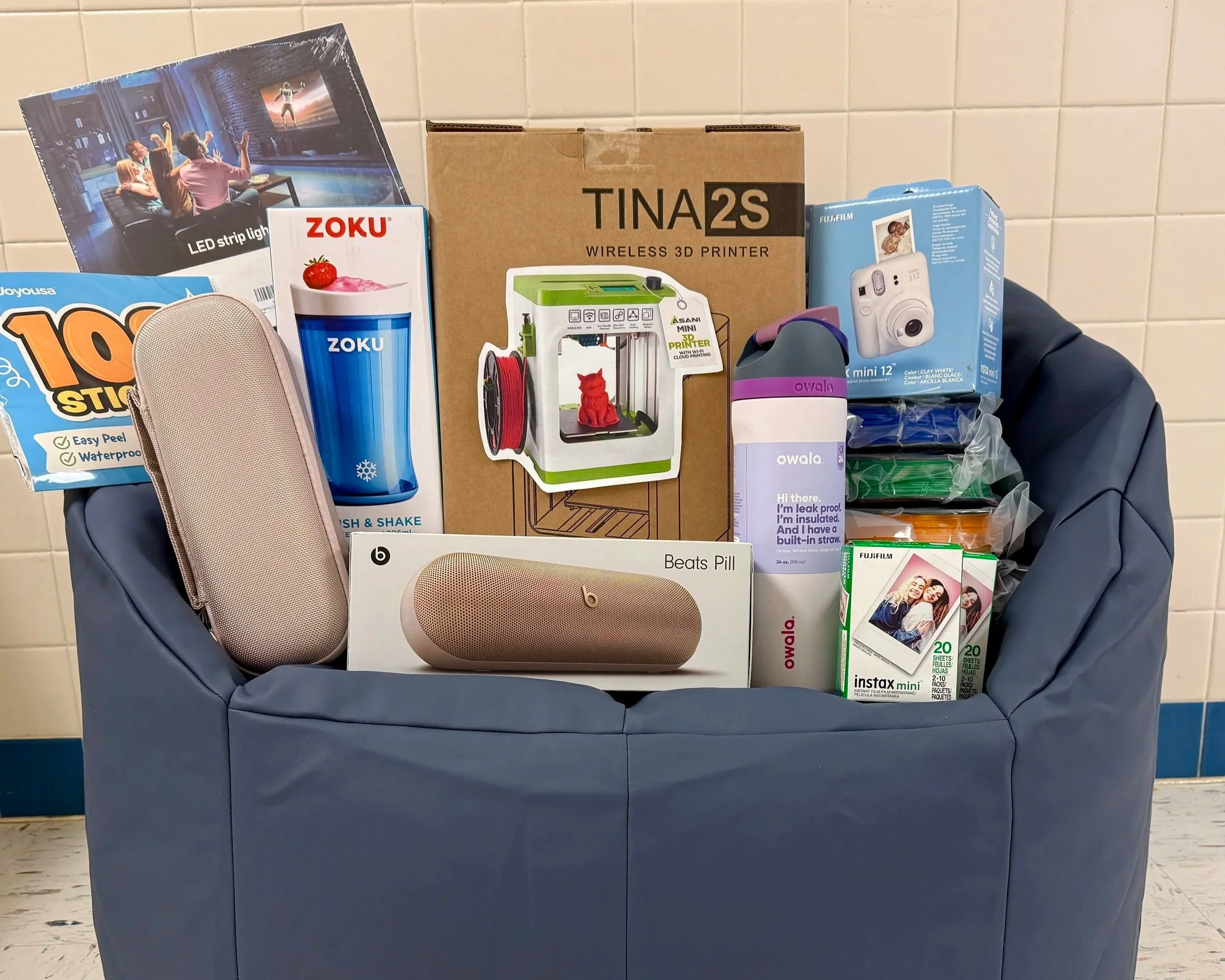 Packed with creativity, tech, and just the right amount of fun, this basket is a tween dream come true! Bring ideas to life with a 3D printer. Blast your favorite playlists with friends on the Beats Pill speaker. Capture every favorite moment with a Fujifilm Instax camera. Whip up icy treats with the Zoku slush and shake maker. Add strikes for an unforgettable outing with a Bowlero gift card. Just peak in this basket for more trend-setting fun!